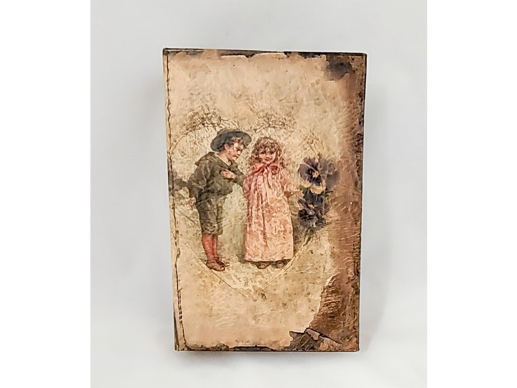 Ručně vyráběná dřevěná krabice ve tvaru knihy, potažená syntetickou kůží, se zavíráním na magnet a nostalgickým motivem dětí.