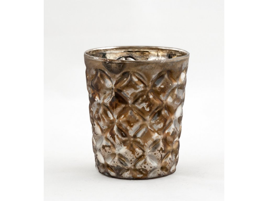Svícen s reliéfním povrchem a starobronzovou patinou. Na čajovou svíčku.