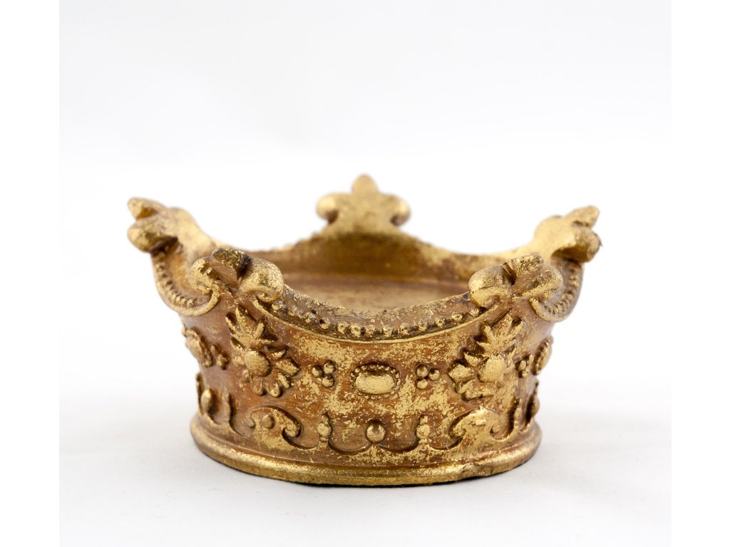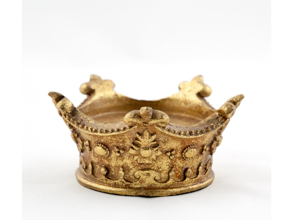Svícen ve tvaru koruny se zlatou patinou a reliéfním vzorem. Na svíčku o průměru 5 cm.
