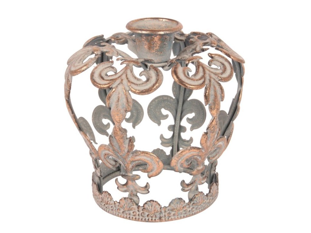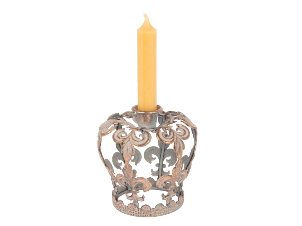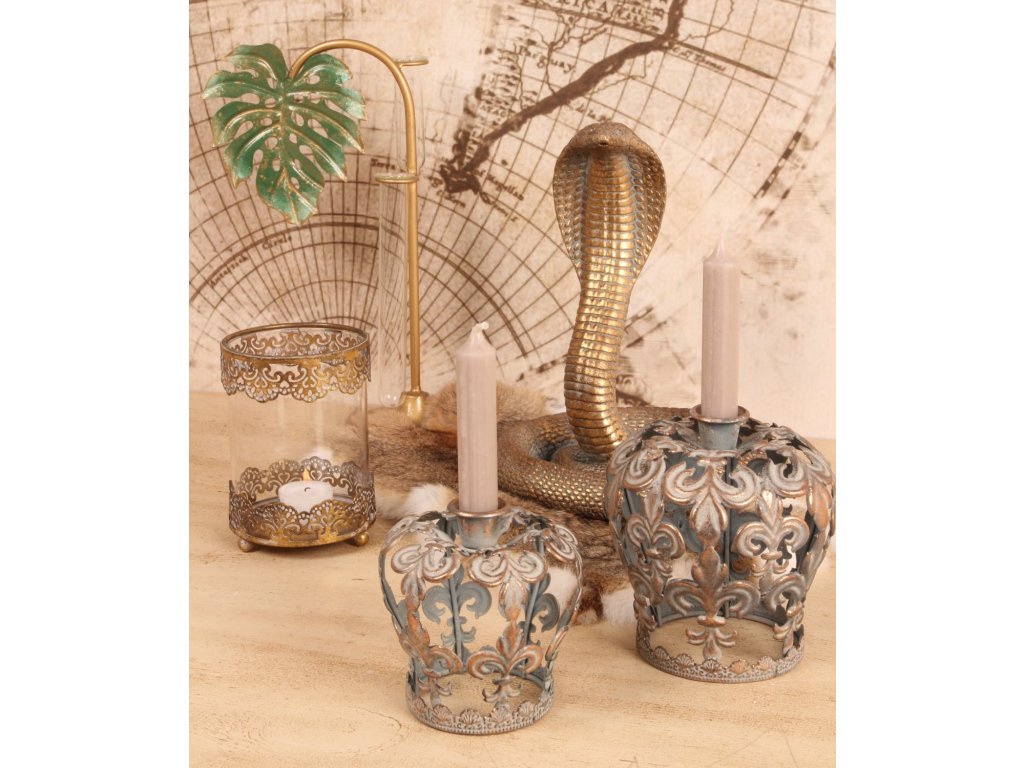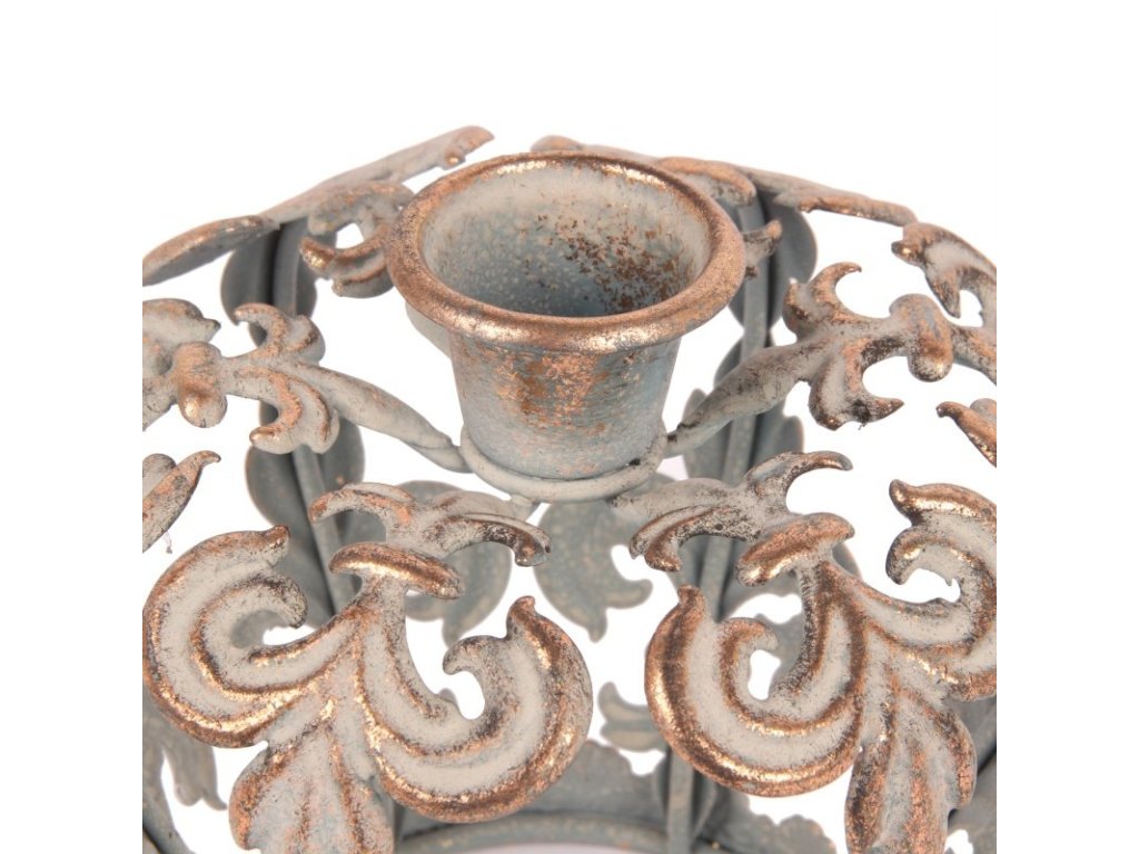 Vneste do svého domova francouzské kouzlo s vintage zlatým svícnem zdobeným květy lilií. Svícen je vyroben z kovu s vintage zlatým a modrým povrchem. Pro svíčku o průměru 2 cm.